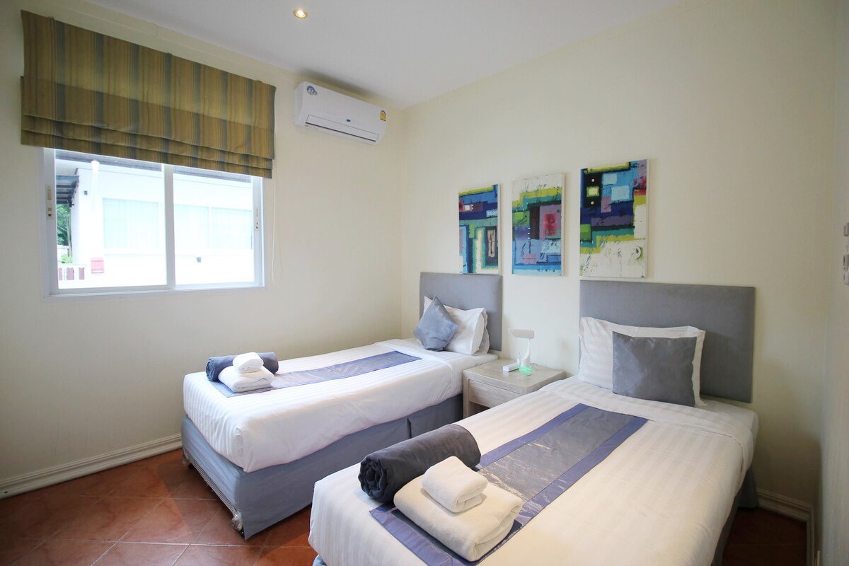 4th Bedroom – Two single beds that can be pushed together to make a double bed. This is the smaller bedroom in the villa. Ideal for kids. There is also a small en-suite bathroom, with a small shower area. No wardrobe.
