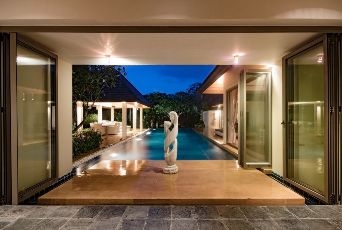 This modern luxury 5 bedroom garden pool villa is set amidst spaciously lush tropical gardens within a private community of 32 villas. The unique and well-regarded concept design achieves a relaxing ambiance, while the villas are contoured to create an interior courtyard featuring a magnificently large “Infinity” Pool.