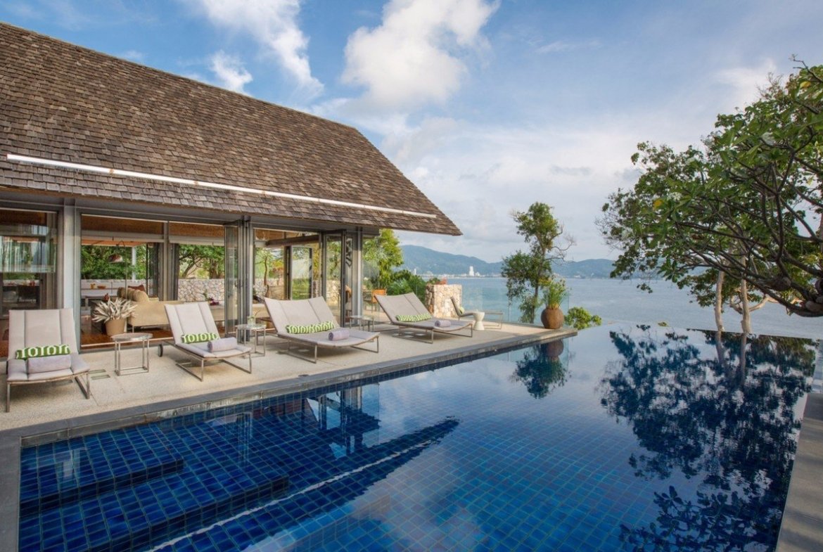 It is direct Oceanfront, has a 4,000 square meter garden with lawns and access to the ocean in addition to the 1,000+ square meter villa plot. From the villa, you will see sunrise and sunset as well as open ocean, Patong bay and Patong Beach views