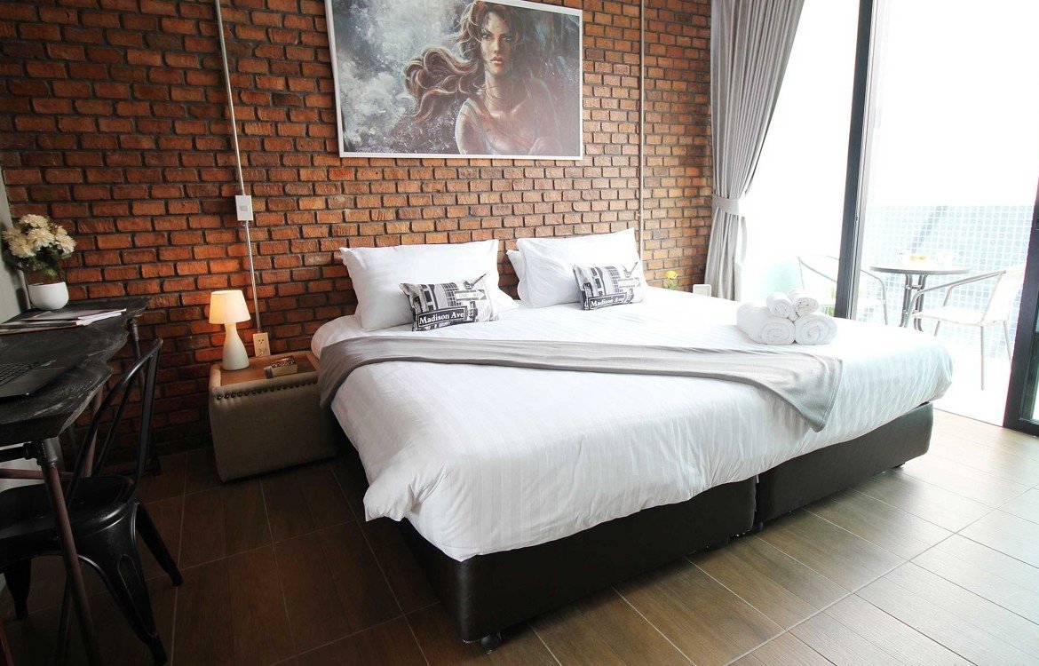 The interior of the apartment follows closely with industrial style loft design with exposed piping, concrete and brick finishes to industrial bar stools that makes this apartment stand out from the rest.