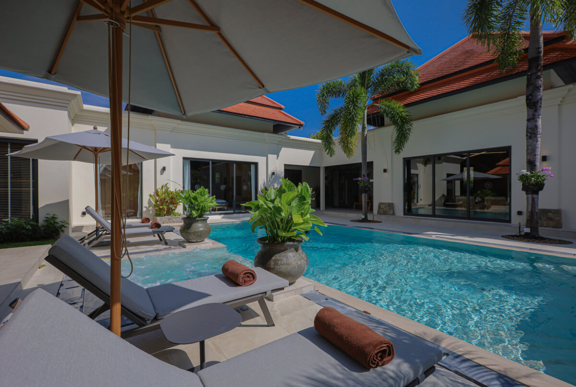 Discover the perfect blend of tropical serenity and modern luxury with this stunning 5-bedroom, 5-bathroom pool villa located in the prestigious Sai Taan Villas estate in Choeng Thale, Phuket. Just minutes from the pristine sands of Bang Tao Beach, this beautifully designed residence presents a rare opportunity to own a premium home in one of the island’s most desirable neighborhoods.